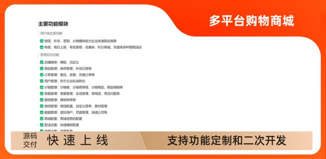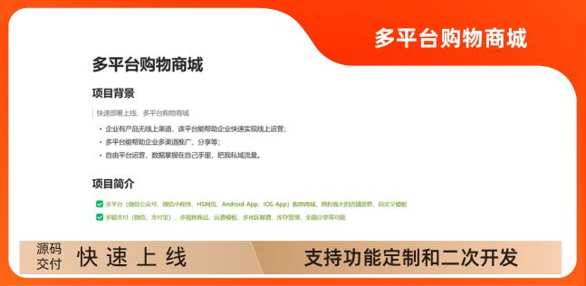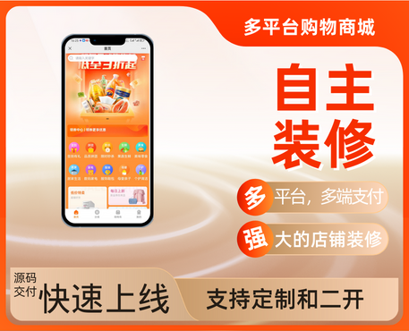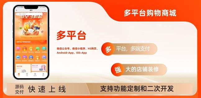 多平台(微信公众号、微信小程序、H5网页、Android-App、IOS-App)购物商城,拥有强大的店铺装修、自定义模板、路由同步、多端支付(微信,支付宝)、多规格商品、运费模板、多地区邮费、库存管理、全端分享等功能